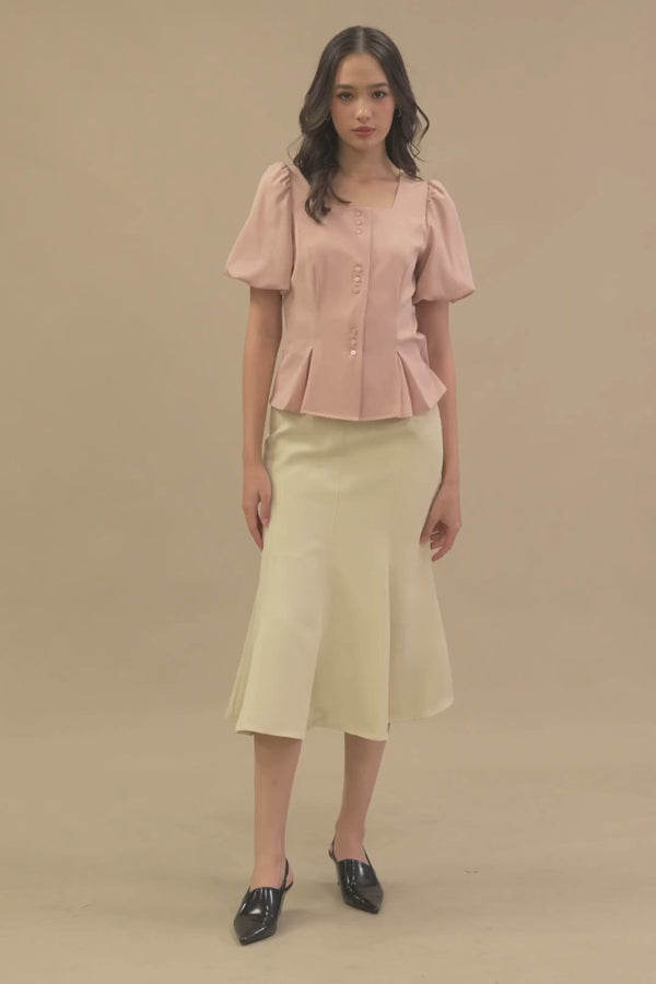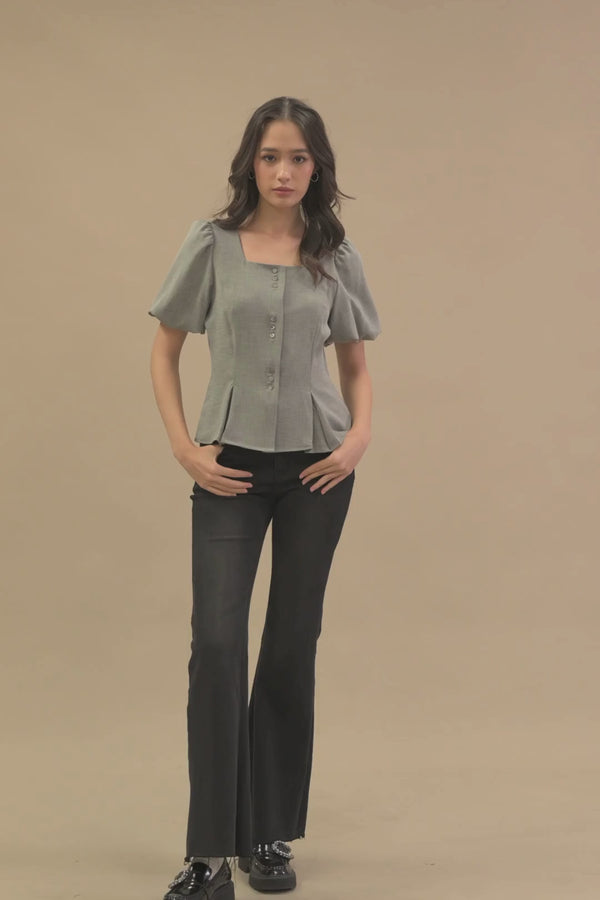 The Herovia Puff Sleeve Peplum Blouse is crafted from textured cotton fabric, featuring a flattering square neckline and short puff sleeves with stretchable openings and delicate tulle lining. Front button fastening and a peplum hemline enhance its elegant silhouette, making it a sophisticated addition to any wardrobe.