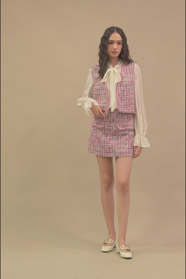 Elevate your style with our Charlittea Tweed Vest, Blouse and Skirt Set. This luxurious 3-piece set features a tweed vest with fuzzy trimming, a blouse with a ribbon tie and elegant puff sleeves, and a high-waisted pleated skirt.